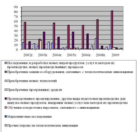 В 2008-2009гг. вновь возросли затраты на приобретение машин и оборудования, связанных с технологическими инновациями до 62, 8%, затраты на исследование и разработку новых видов продуктов, услуг и методов производства технологических инноваций, новых производственных процессов – до 22, 7%, приобретение новых технологий практически отсутствует. Права на патенты, лицензии на использование изобретений, промышленных образцов, полезных моделей за анализируемый период не приобретались. Это свидетельствует не только о финансовых проблемах, но и о сокращении исследовательской и маркетинговой деятельности на промышленных предприятиях, а также о снижении подготовки персонала, связанного с инновациями.