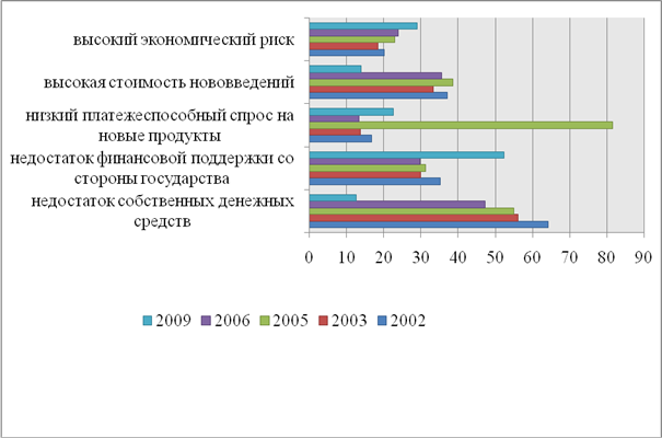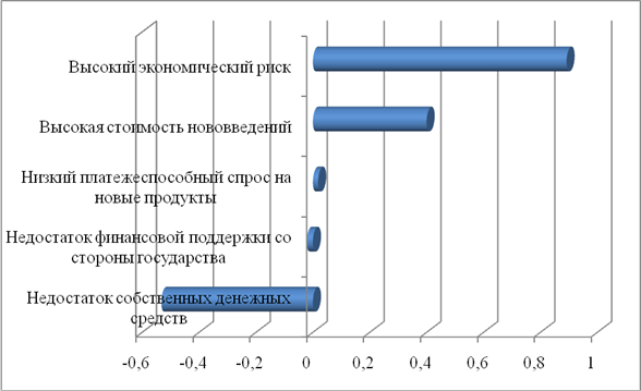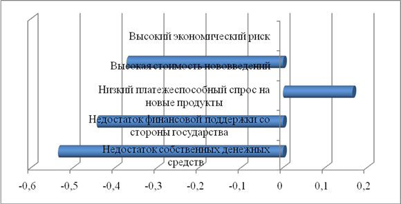 Недостаток собственных денежных средств | Недостаток финансовой поддержки со стороны государства | Низкий платежеспособный спрос на новые продукты | Высокая стоимость нововведений | Высокий экономический риск |