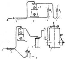 Рис. 2. Схема установки для зварювання з газоподібним флюсом при живленні ацетиленом від балона (а) та від ацетиленового генератора (б) ;