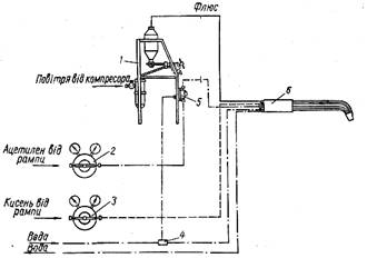 1 — балон з ацетиленом; 2 — флюсоживильник; 3 — пальник: 4 — балон з киснем; 5 — ацетиленовий редуктор; 6 — кисневий редуктор; 7 — ацетиленовий генератор; 8 — осушник.