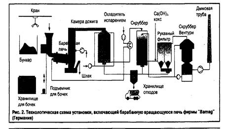 В мировой практике наиболее широко применяют термическое обезвреживание медицинских отходов во вращающихся барабанных печах. Технологическая схема включает в себя барабанную печь, камеру дожигания, котел-утилизатор, многоступенчатую систему очистки дымовых газов (рис.2). Следует отметить, что в технологическом отношении барабанные вращающиеся печи с жидким шлакоудалением являются наиболее универсальными термическими реакторами для переработки крупнокусковых отходов переменного состава.