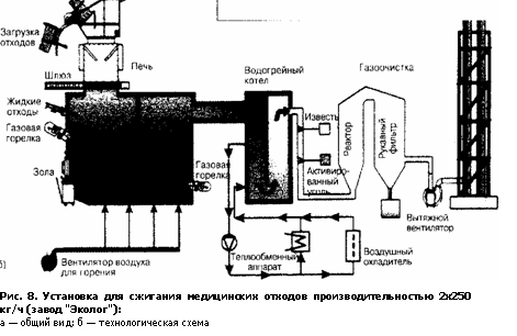 Например, в г. Гамбурге для термического обезвреживания твердых, жидких и пастообразных отходов, включая медицинские, доставляемые из Испании, применяют установку фирмы AVG (Германия), включающую две технологические линии по 6,3 т/ч.