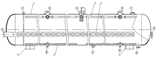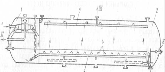 1 - корпус, 2 - опора подвижная, 3 - сборник нефти, 4 - маточник входа эмульсии, 5 - пропарочная линия, 6 - опора неподвижная