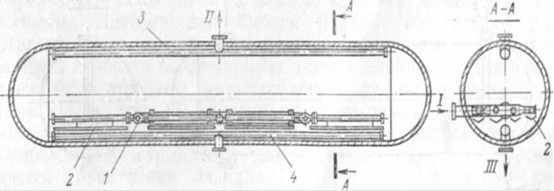 1 - распределитель эмульсии; 2 - отбойник; 3 - сборник нефти; 4 - сборник воды; I - эмульсия; II - нефть; III - вода.
