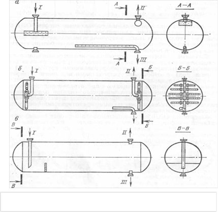 а - отстойник типа ОГД-200: б - отстойник с торцевыми маточниками; в - отстойник конструкции СибНИИНП; I - эмульсия; II - нефть; III - вода.