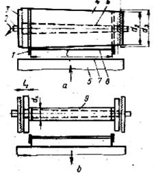 Рис. 10.1. Схемы лущения чурака с гнилью в начальный (а) и конечный (б) моменты обработки: 1 - подрезающие ножи, 2 - шпиндель, 3 - зажимной элемент, 4 - чурак, 5 -суппорт, 6 - гниль, 8 - лущильный нож, 9 - карандаш.