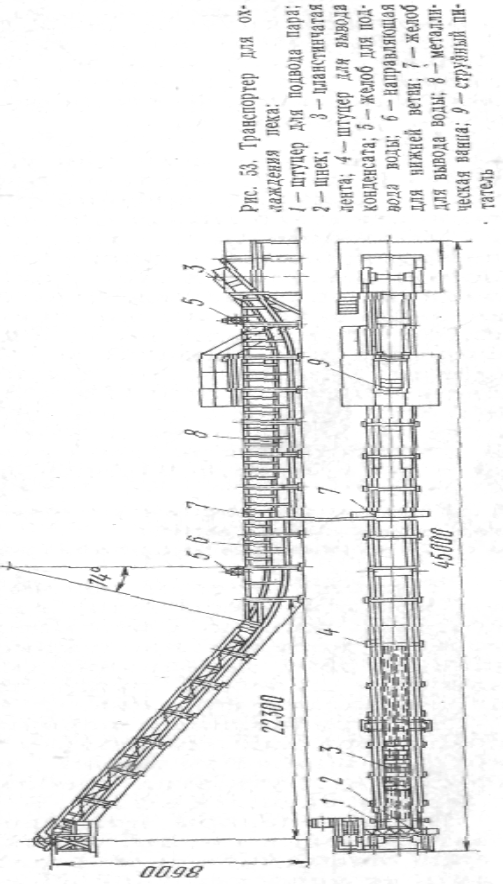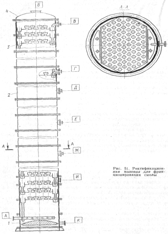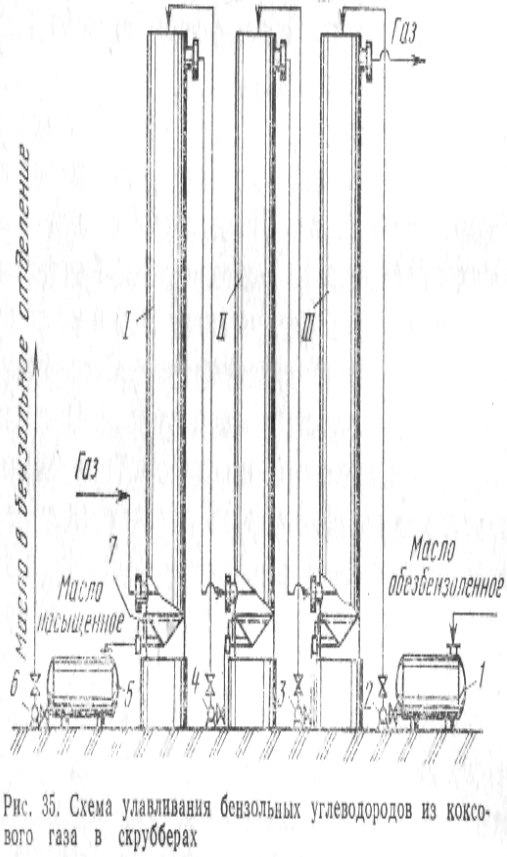 Па мал. 34 приведена схема кінцевого охолодження коксопого газу з застосуванням гарячої смоли для вимивання нафталіну з води. Верхня газова частина кінцевого холодильника обладнана полками і служить для охолодження газу. У полках мається значна кількість отворів діаметром 10 мм. Нижня частина холодильника служить промывателем і тому обладнана вісьма полками з отвором 3 мм.