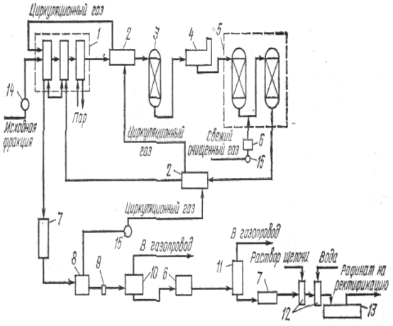 Рафінад після стабілізаційної (опарної) колони 11, холодильника 7 попадає в промыватели лугу 12, а потім у сховищі 13, відкіля направляється на ректифікацію. Циркуляційний газ після сепаратора високого тиску 8 за допомогою компресора 15 подається в систему. Енергетичні витрати процесу гідроочищення на 1 т сировини (фракції БТКС) складають: електроенергії 90— 120 квг-ч; пари 1,89—2,52 МДж; води 1,5 м3 .