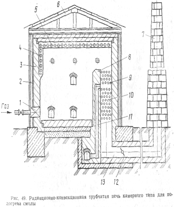 Казан-пек-казан для спалювання сірководневого газу (мал. 32). У ньому сполучають дві операції: спалюють сірководневий газ і утилізують тепло продуктів згоряння, що утворилися, для одержання водяної пари. Пек-казан складається з циліндричного сталевого кожуха, футерованного вогнетривким матеріалом. У печі знаходяться труби екранованої системи казана. Кінці труб входять у нижній і верхній колектори. На верху печі поміщений барабан казана, з'єднаний з колектором екранованої системи. Пальники можуть бути розташовані чи угорі внизу і відповідно продукти згоряння виводяться чи знизу зверху. Топка печі-казана постачена вибуховим клапаном і оглядовими стеклам». Діаметр казана 3,820—4,828 м, висота 7,8—13,1 м.