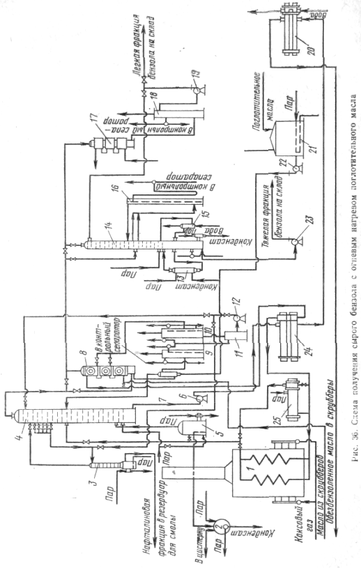 Залишок від ректифікації сирого бензолу — сольвент-нафта -з колони надходить у сховище 20. Сольвент-нафта передається в смолоперсгснный цех, де з її шляхом кристалізації виділяють пафталип.