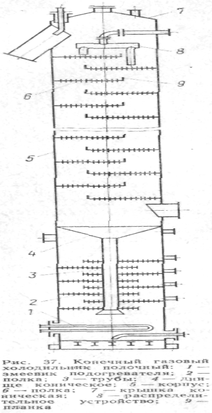 Холодильник для сірководневих газів прохолоджує вологий газ після вакуум-насоса, він складається з трьох, з'єднаних послідовно трубчаток із загальною поверхнею теплопередачі 48 X 3 = 144 ма , має 132труби довжиною 5500 мм, число ходів у трубному просторі 4, у межтрубном.
