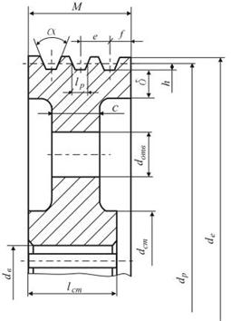 Выходная мощность Рвых = 1,1 кВт; число оборотов выходного вала nвых = 35; режим работы – тяжелый; срок службы привода – 3 года (рабочих дней – 300, одна смена длится 8 часов, число смен работы – 3); передаточное число редуктора Uр = 14; первая ступень редуктора – прямозубая; разработать рабочий чертеж большего шкива клиноременной передачи.