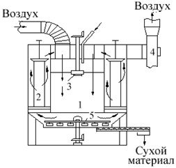 Завдяки розвиненій поверхні зіткнення матеріалу з газом, сушка протікає дуже швидко - на льоту, і на дно сушарки падає вже повністю висушений матеріал. Звідси він шкрябаннями 5 подається в розвантажувальний шнек або інший розвантажувальний пристрій, що герметизується. Повітря, насичене парою, відсисається вентилятором 4 з нижньої частини сушарки через рукавні фільтри 2, як на малюнку 15, або інший пиловловлюючий апарат. Паралельний струм створює можливість застосовувати для сушки високу температуру газу, збільшуючи швидкість сушки, без перегріву висушуваного матеріалу.