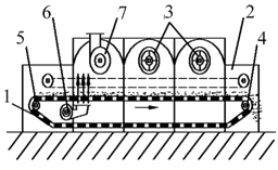 1 - живильник; 2 - нескінченна сітчаста стрічка; 3 - валок; 4 - молоток; 5 - розвантажувальний шнек; 6 - вентилятори
