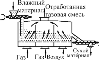 Вологий матеріал з бункера 1 за допомогою живильника 2 потрапляє в сушильний барабан 3, що обертається. Паралельно матеріалу в сушарку подається сушильний агент, що утворюється при згоранні палива в топці 4 і змішення газів в камері змішувача 5. Повітря в топку і камеру змішувача подається вентиляторами 6,7. Висушений матеріал з протилежного кінця сушильного барабана 8, а з нього на транспортуючий пристрій 9.