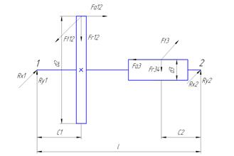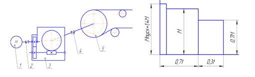 5-барабан. Движение от электродвигателя через муфту передается на входной вал редуктора, далее, через цилиндрическую косозубую передачу 1-2 на промежуточный вал 2-3 редуктора и, затем, через червячную передачу 3-4 на выходной вал 4 редуктора, затем через муфту на приводной барабан.