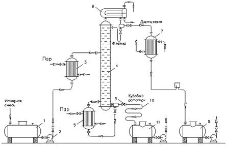 Из кубовой части колонны насосом-9 непрерывно выводится кубовая жидкость – продукт, обогащенный труднолетучим компонентом, который охлаждается в теплообменнике-10 и направляется в емкость-11.