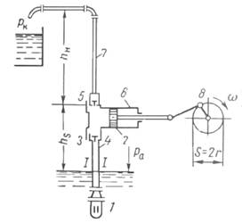 Действие поршневого насоса за один оборот коренного вала можно расчленить на его составляющие: процесс всасывания, при котором происходит подъем жидкости из нижнего резервуара в цилиндр насоса, и процесс нагнетания, при котором жидкость вытесняется из цилиндра с энергией, достаточной для преодоления всех видов сопротивлений на напорной стороне насоса.