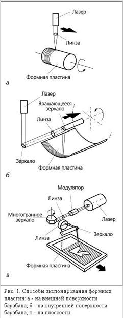 В современных системах CTP, ориентированных на изготовление офсетных и фотополимерных форм высокой и флексографской печати, применяют лазерные формовыводные устройства трех основных принципов (рис.1):