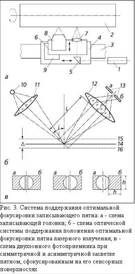 На выходе фотоприемника находится устройство, которое формирует электрический сигнал, пропорциональный разности освещенностей зон а и б, который имеет либо положительный, либо отрицательный знак. После усиления мощности этот сигнал поступает на привод 9 перемещения дополнительной каретки, являющийся выходом цепи обратной связи. Перемещение дополнительной каретки 6 приводит пятно лазерного излучения в положение 14 оптимальной фокусировки. Разностный электрический сигнал становится нулевым.