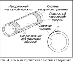 Формные пластины крепятся на внешней поверхности барабана с помощью механического, магнитного, вакуумного прижима или их комбинаций. На рис.4 представлена система крепления формных пластин, состоящая из подвижных (под разный формат пластин) зажимов в сочетании с вакуумным прижимом. Такая система надежно фиксирует пластины даже при высокой частоте вращения барабана - до 1000 об. /мин.
