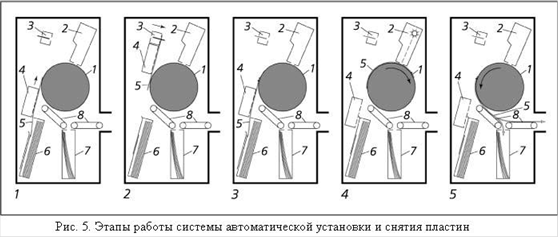 Некоторые формовыводные устройства оснащены системой автоматической установки формных пластин на внешнюю поверхность барабана и снятия их после экспонирования, а также системой пробивки штифтовых отверстий. На рис.5 показаны этапы (1-5) работы такой системы. Формная пластина 5 с помощью пневматического устройства подачи 4 вынимается из сдающей кассеты 6 и переносится к устройству пробивки штифтовых отверстий 3. Затем устройство 4 подводит край пластины с отверстиями к барабану 1 и надевает ее на штифты. При повороте барабана 1 на один оборот пластина полностью прилегает к нему и закрепляется зажимами. После этого барабан начинает вращаться, а записывающая головка 2, перемещаясь вдоль образующей барабана, экспонирует пластину. По окончании экспонирования барабан останавливается и поворачивается на один оборот назад. При этом пластина снимается со штифтов и с помощью транспортеров 8 подается в приемную кассету 7 или в процессор для обработки форм, соединенных с формовыводным устройством.