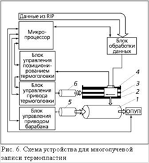 В качестве примера многолучевой лазерной записи формных пластин, расположенных на внешней поверхности барабана, рассмотрим схему устройства для экспонирования термочувствительных пластин мощным инфракрасным многоканальным лазерным диодом, приведенную на Рис.6. В этом устройстве лазерный диод и формирующая изображение оптика смонтированы в термоголовке 4, которая перемещается с помощью ходового винта 3 по направляющим 2 вдоль барабана 1.