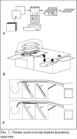 Все три секции объединены системой транспортирования пластин, конструкция которой в разных моделях формовыводных устройств имеет свои особенности. Так, система транспортирования, представленная на рис.7а, передает пластины из кассеты с вертикальным их размещением в секцию экспонирования также в вертикальном положении. В секции экспонирования пластина с помощью вакуума располагается на внутренней поверхности барабана. После пробивки штифтовых отверстий и экспонирования пластина вновь принимает вертикальное положение и передается в секцию вывода. В секции вывода пластина из вертикального положения переводится в горизонтальное и выходит на приемное устройство или в подсоединенный к нему процессор.