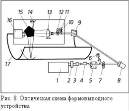 Специальная оптическая система имеет двойную фокусировку луча: до и после многогранного зеркала. Оптическая система компенсации нелинейности развертки и угла поворота луча обеспечивает точное соблюдение геометрических размеров изображения.