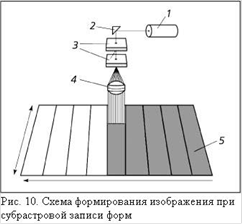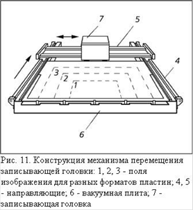 Существуют плоскостные формовыводные устройства, в которых изображение на формной пластине записывается методом субрастрового сканирования (рис.10). Для этого записывающая головка, оснащенная ND YAG-лазером 1, зеркалом 2, акустооптическим модулятором 3 и фокусирующим объективом 4, совершает непрерывное возвратно-поступательное движение по одной оси координат и стартстопное поступательное движение по другой оси. Акустооптический модулятор 3 работает в режиме акустооптического дефлектора, производя одновременно модуляцию и отклонение луча перпендикулярно возвратно-поступательному движению записывающей головки. Таким образом, за один проход головки от одного края пластины 5 до другого записывается целая полоска изображения небольшой ширины. После записи полоски на пластине, размещенной на вакуумной плите, записывающая головка перемещается на ширину этой полоски и, возвращаясь в исходное положение, записывает следующую полоску и т.д. В результате изображение на формной пластине формируется из отдельных полосок, записанных ортогональными точечно-растровыми строками небольшой длины. Конструкция механизма перемещения записывающей головки по двум координатам представлена на рис.11.