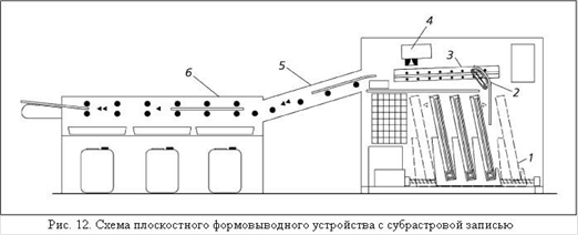 Формовыводное устройство (рис.12) оснащено тремя кассетами для формных пластин и механизмом их смены 1. С помощью устройства подачи 2 пластина размещается на вакуумной плите 3, над которой перемещается в двух направлениях записывающая головка 4. По окончании экспонирования пластина по транспортеру 5 подается в процессор 6 для обработки форм.
