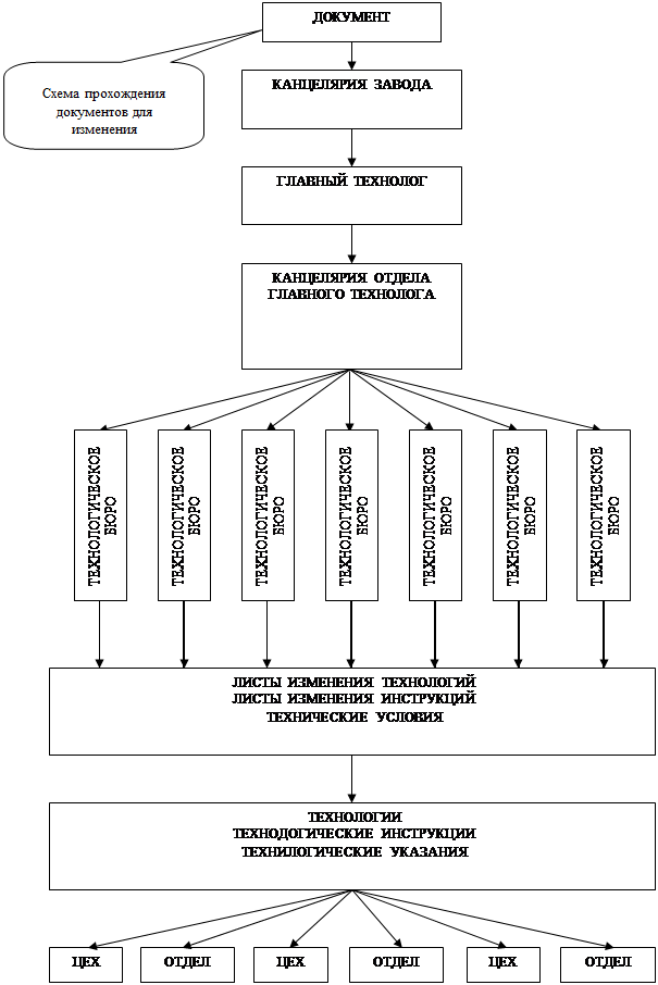 1этап - документ с основанием для изменения технической документации с визой директора /главного инженера/ поступает в канцелярию завода.