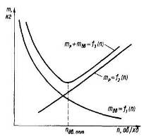 Маса РЕМ на 70 - 80 % визначається масою електродвигунного пристрою, тому для їх привода застосовують високошвидкісні двигуни, якнайменші за масою. З другого боку, підвищення частоти обертання двигуна для РЕМ з невеликою швидкістю руху робочого органу зумовлює необхідність редукторних передач, які ускладнюють машину і тим самим збільшують масу РЕМ. Тому при конструюванні РЕМ знаходять оптимальний варіант співвідношення маси двигуна (т в ) та маси редуктора (тр ) для даної швидкості обертання робо чого органа п (рис. 1). Найменшій загальній масі т„ +тпа р дв відповідає оптимальна частота обертання електродвигуна.