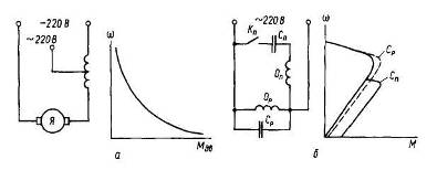 Рис. 3. Схеми вмикання електродвигунів РЕМ колекторного (а), однофазного (б) та їх механічні характеристики