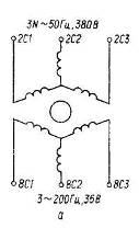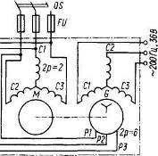 Перетворювач частоти типу ИЗ-9401 (рис. 4) складається з двополюсного асинхронного двигуна М з короткозамкненим ротором і шестиполюсного асинхронного генератора С з фазним ротором. Ротори двигуна і генератора знаходяться на одному валу і обертаються з однаковою частотою. На валу закріплені три ізольованих одне від одного кільця, до яких приєднані виводи обмоток ротора генератора. На кільця генератора через щітки і на обмотки статора електродвигуна подається напруга мережі 220 або 380 В. Напруга 36 В частотою 200 Гц знімається з обмотки статора генератора. Принцип роботи перетворювача такий. У шестиполюсному роторі магнітне поле обертається з частотою 1000 об/хв навколо ротора. У свою чергу ротор генератора обертається в напрямку обертання магнітного поля з частотою близь ко 3000 об/хв. Тому магніт ні силові лінії перетинають витки нерухомої обмотки статора генератора з часто тою обертання близько 4000 об/хв. У цьому випадку в шестиполюсних обмотках статора виникає напруга змінного струму з частотою близько 200 Гц.