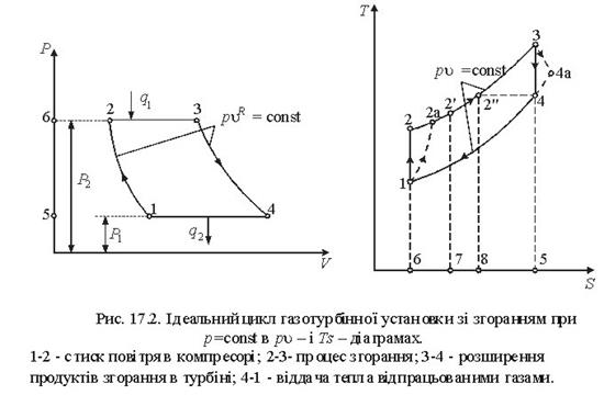 Тема 3.5. Ідеальні циклитеплових машин. Схема ГТУ і зображення циклу ГТУ в_р-уі Т—s координатах Основні процеси циклу ГТУ «відкритого» типу Термічнийккд циклу ГГУ Переваги і недоліки ГТУ «відкритого» типу, и практичне використання Схема поршневого одноступеневого компресора Зображення процесів стиснення в р-v і Т—s координатах Визначення роботи стиснення в різних процесах
