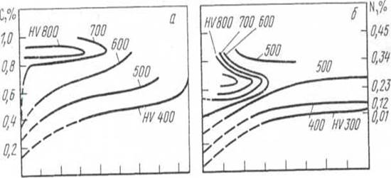 Рис. 2 - Диаграммы прокаливаемости цементованного (а) и нитроцементованного (б) слоя стали 25 ХГТ