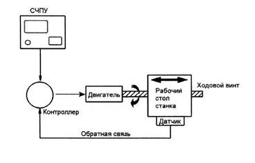 Привод подачи для станков с ЧПУ.В качестве привода используют двигатели, представляющие собой управляемые от цифровых преобразователей синхронные или асинхронные машины. Бесколлекторные синхронные (вентильные) двигатели для станков с ЧПУ изготавливают с постоянным магнитом на основе редкоземельных элементов и оснащают датчиками обратной связи и тормозами. Асинхронные двигатели применяют реже, чем синхронные. Привод движения подач характеризуется минимально возможными зазорами, малым временем разгона и торможения, небольшими силами трения, уменьшенным нагревом элементов привода, большим диапазоном регулирования. Обеспечение этих характеристик возможно благодаря применению шариковых и гидростатических винтовых передач, направляющих качения и гидростатических направляющих, беззазорных редукторов с короткими кинематическими цепями и т.д.