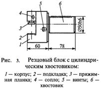 Резец закрепляют винтами через прижимную планку 3. Для установки резца по высоте центров служит подкладка 2. Два регулировочных винта 5, расположенных под углом 45° один к другому, позволяют при наладке вывести вершину резца на заданные координаты. Подача СОЖ в зону резания осуществляется через канал в корпусе 1, заканчивающийся соплом 4, позволяющим регулировать направление подачи СОЖ. Магазины инструментов (вместимостью 8...20 инструментов) применяют редко, так как практически для токарной обработки одной заготовки требуется не более 10 инструментов. Использование большого числа инструментов целесообразно в случаях точения труднообрабатываемых материалов, когда инструменты имеют малый период стойкости. Расширение технологических возможностей токарных станков возможно благодаря стиранию грани между токарными и фрезерными станками, добавления внецентрового сверления, фрезерования контура (т.е. программируется поворот шпинделя); в некоторых случаях возможно резьбонарезание несоосных элементов заготовок.