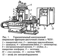 Благодаря оснащению многоцелевых станков (МС) устройствами ЧПУ и автоматической смены инструмента существенно сокращается вспомогательное время при обработке и повышается мобильность переналадки. Сокращение вспомогательного времени достигается благодаря автоматическим установке инструмента (заготовки) по координатам, выполнению всех элементов цикла, смене инструментов, кантованию и смене заготовки, изменению режимов резания, выполнению контрольных операций, а также большим скоростям вспомогательных перемещений. По назначению МС делятся на две группы: для обработки заготовок корпусных и плоских деталей и для обработки заготовок деталей тел вращения. В первом случае для обработки используют МС сверлильно-, фрезерно-, расточной группы, а во втором токарной и шлифовальной групп. Рассмотрим МС первой группы, как наиболее часто используемые. МС имеют следующие характерные особенности: наличие инструментального магазина, обеспечивающего оснащенность большим числом режущих инструментов для высокой концентрации операций (черновых, получистовых и чистовых), в том числе точения, растачивания, фрезерования, сверления, зенкерования, развертывания, нарезания резьбы, контроля качества обработки и др.; высокая точность выполнения чистовых операций (6...7-й квалитеты). Для систем управления МС характерны сигнализация, цифровая индикация положения узлов станка, различные формы адаптивного управления. МС-это в основном одношпиндельные станки с револьверными и шпиндельными головками. Многоцелевые станки (обрабатывающие центры) для обработки заготовок корпусных деталей. МС для обработки заготовок корпусных деталей подразделяют на горизонтальные (Рис. 7) и вертикальные.