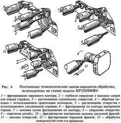 Обработка заготовок на МС по сравнению с их обработкой на фрезерных, сверлильных и других станках с ЧПУ имеет ряд особенностей. Установка и крепление заготовки должны обеспечивать ее обработку со всех сторон за одну установку (свободный доступ инструментов к обрабатываемым поверхностям), так как только в этом случае возможна многосторонняя обработка без переустановки. Обработка на МС не требует, как правило, специальной оснастки, так как крепление заготовки осуществляется с помощью упоров и прихватов. МС снабжены магазином инструментов, помещенных на шпиндельной головке, рядом со станком или в другом месте. Для фрезерования плоскостей используют фрезы небольшого диаметра и обработку производят строчками. Консольный инструмент, применяемый для обработки неглубоких отверстий, имеет повышенную жесткость и, следовательно, обеспечивает заданную точность обработки. Отверстия, лежащие на одной оси, но расположенные в параллельных стенках заготовки, растачивают с двух сторон, поворачивая для этого стол с заготовкой. Если заготовки корпусных деталей имеют группы одинаковых поверхностей и отверстий, то для упрощения составления технологического процесса и программы их изготовления, а также повышения производительности обработки (в результате сокращения вспомогательного времени) в память УЧПУ станка вводят постоянные циклы наиболее часто повторяющихся движений (при сверлении, фрезеровании). В этом случае программируется только цикл обработки первого отверстия (поверхности), а для остальных задаются лишь координаты (X и Y) их расположения. В качестве примера на рис. 8 показаны некоторые постоянные технологические циклы, включенные в программное обеспечение и используемые при обработке на станке модели ИР320ПМФ4.