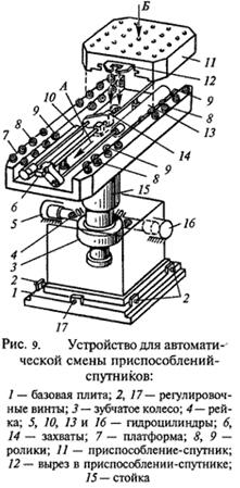 Устройство для автоматической смены приспособления-спутника (ПС) на станке модели ИР500МФ4 показано на рис. 9. ПС 11 устанавливают на платформу 7 (вместимостью два ПС), на которой смонтированы гидроцилиндры 10 и 13. Штоки гидроцилиндров имеют Т-образные захваты 14 и 6. При установке на платформу (перемещение по стрелке Б) ПС вырезом 12 входит в зацепление с захватом 14 штока. На платформе ПС базируется на роликах 9 и центрируется (по боковым сторонам) роликам 8 (исходное положение ПС в позиции ожидания). Перемещение штока гидроцилиндра 10 обуславливает качение (по роликам) спутника. При движении штока гидроцилиндра 13 захват 6 перемещается (по направляющей штанге) и катит ПС по роликам 9 и 8 (в направлении стрелки А) на поворотный стол станка, где спутник автоматически опускается на фиксаторы. В результате захват 6 выходит из зацепления с ПС и стол станка (с закрепленным на нем спутником) на быстром ходу перемещается в зону обработки. Заготовку закрепляют на спутнике во время обработки предыдущей заготовки (когда ПС находится в позиции ожидания) или заранее, вне станка. После того как заготовка будет обработана, стол станка автоматически (на быстром ходу) передвигается вправо к устройству для смены спутника и останавливается в таком положении, при котором фигурный паз ПС оказывается под захватом 6. Гидроцилиндр поворотного стола расфиксирует спутник, после чего ПС входит в зацепление с захватом 6, а масло поступает в штоковую полость гидроцилиндра 13, шток смещается в крайнее правое положение и перемещает спутник с заготовкой на платформу 7, где уже находится ПС с новой заготовкой. Чтобы поменять спутник местами, платформа поворачивается на 180° (на стойке 15) зубчатым колесом 3, сопряженным с рейкой 4, приводимой в движение гидроцилиндрами 5 и 16.
