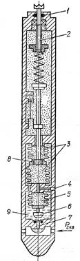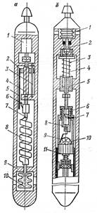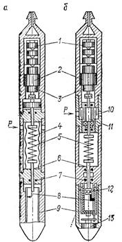 Под влиянием скважинного давления р поршень6 (рис. 10.4, а), уплотненный резиновым кольцом 7, деформирует винтовую цилиндрическую пружину 5 и перемещается на ход, пропорциональный измеренному давлению.