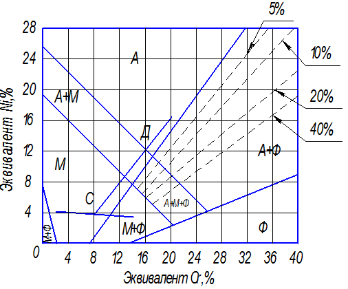 Точку, соответствующую структуре проволоки нанесли на диаграмме Шеффлера. Далее провели линию разбавления присадочного металла с основным металлом (точка С – Св-0Х17Н13М2Т). Нашли долю участия основного металла на линии разбавления, при которой будет сохраняться аустенитная структура (точка Д). Эта точка разделяет аустенитную структуру и аустенитно-мартенситную структуры на диаграмме.