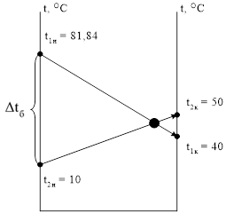 Из температурной схемы противоточного движения видно, что "пересечения температур" в этом варианте теплообмена не происходит, на протяжении всего временного интервала имеется разность температур. Этот вариант принимается к дальнейшему обсуждению.