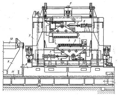Газорежущие блоки верхний 1 и нижний 2 установлены на суппортах: 3 и 4, перемещаемых по вертикали и горизонтали гидроцилиндрами 5 и 6. Вертикальные стойки машины 7 установлены на раме 8, скрепленной с рамой 9 двухроликовой секции рольганга 10; если не требуется огневая зачистка металла (а также в случае ремонта), МОЗ может быть смещена с линии потока металла путем передвижения машины по фундаментной плитовине 11 (при помощи реечной передачи), при этом освободившееся место будет занято секцией рольганга 10.