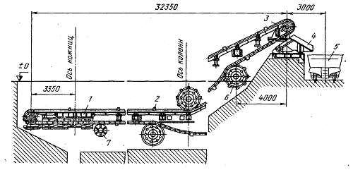 Направляющие планки, по которым движется верхняя ветвь цепей, смазываются густой мазью от автоматической смазочной системы. Скорость движения цепи 6,4 м/мин; ширина рабочего полотна конвейера 1790 мм; масса конвейера 180 т.
