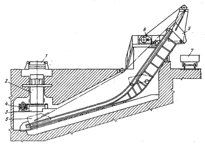 Цепной скребковый транспортер (рисунок 2) расположен поперек двух пролетов: станового и скрапного. Приемная часть конвейера находится в первом пролете ниже уровня пола цеха (под ножницами), а разгрузочная наклонная часть конвейера — в скрапном пролете с железнодорожным путем для платформ. По наклонному желобу у ножниц обрезки подают вниз и попадают на приемную плиту 1. Скребки 2, прикрепленные к звеньям боковых цепей, перемещают горячие обрезки массой до 1,5 т каждый по промежуточным плитам к разгрузочному желобу 4, с последнего обрезки падают непосредственно в полузакрытую платформу 5.
