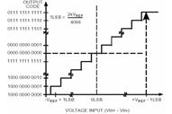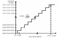 В псевдодифференциальном или однополярном режиме входной сигнал находится в диапазоне 0...VREF. Выходной код в псевдодифференциальном или однополярном режиме – прямой двоичный код, единица младшего разряда (LSB) соответствует 1 LSB = FS/4096 или 2.5 В/4096 = 0.61 мВ = 610 мкВ при опорном напряжении VREF = 2.5 В. В идеале характеристика преобразования проходит через точки 1/2 LSB, 3/2 LSBs, 5/2 LSBs, . . ., FS–3/2 LSB. Идеальная характеристика преобразования показана на рисунке 12.