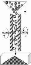 Порошкообразные вещества поступают из загрузочного бункера с регулирующим шибером в пространство между вращающимися навстречу друг другу с высокими скоростями дисками (угловая скорость с использованием высокочастотных двигателей до 50000 об/мин и более). На этих роторах имеются специальные твердосплавные пальцы или лопасти, образующие относительно друг друга концентрические окружности разных диаметров. Каждая частица соударяется с указанными выступами, последовательно проходя все круги, перед выходом с последнего из них, имеющего максимальную линейную скорость, частицы испытывают наиболее высокоэнергетическое воздействие. Такой способ измельчения приводит не только к увеличению дисперсности системы, но и к дополнительной механохимической активации порошков, проявляющейся в их более интенсивном последующем спекании, либо ускоренном твердофазном синтезе.